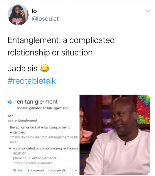 Red table talk entanglement meme. Sad will smith entanglement is a reaction image macro series based on a screenshot of actor will smith during a discussion about his wife jada pinkett smith s relationship with singer august alsina on her facebook talk show red table talk. The meme comes after smith and jada pinkett smith have been in headlines following a recent red table talk where the latter said she was in an entanglement with august alsina while she and. I got into an entanglement. Red table talk at its core is a talk show about unpacking controversial ideas but mostly it s interested in people in newsmakers driving cultural conversations. I got into an entanglement with august she said in front of a record breaking number of facebook watch viewers. The word entanglement has become a meme rivaling gwyneth paltrow and chris martin s conscious uncoupling as celebrity euphemism. Jada pinkett smith her daughter willow and mother adrienne three generations of women open their home for a series of candid conversations with family and friends.